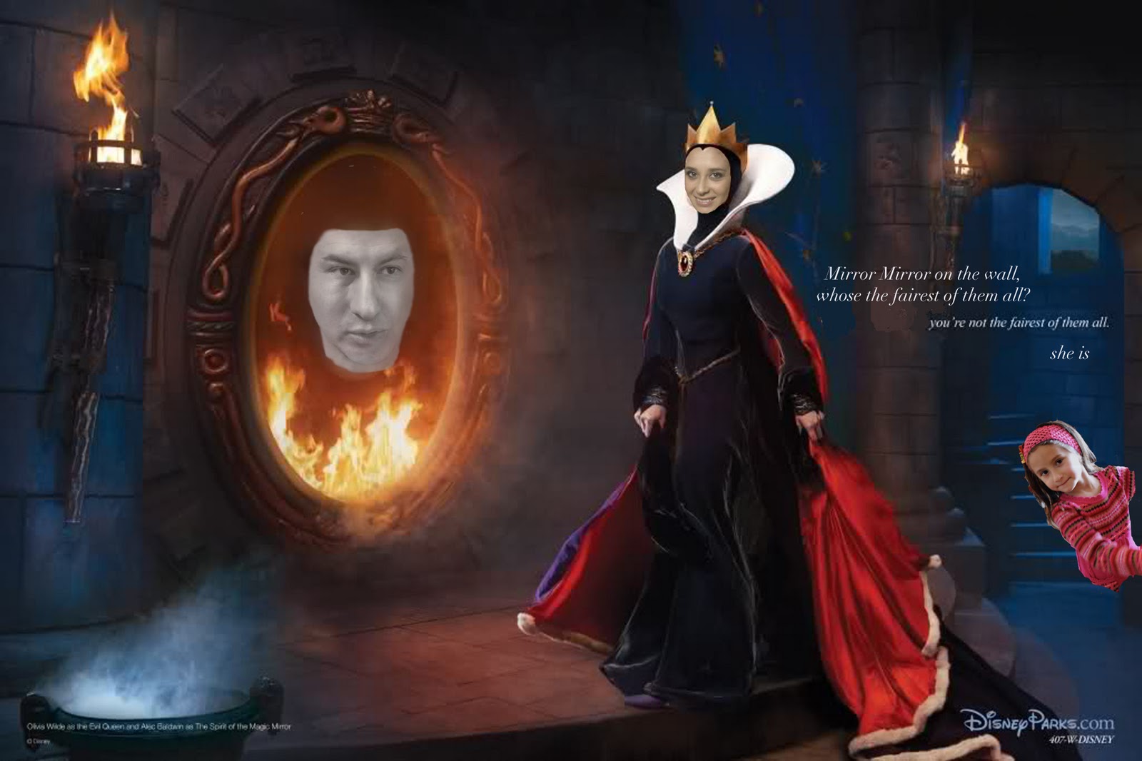 The picture that I chose to do was a quite entertaining one with a subtle message and a personal approach to it. I used many pictures, three of them are layers and they were all taken by me because its a picture of my cousin, my uncle and me. The background picture was part of one of my favorite's photographer's, Annie Lebovitz, Disney series. I used various tools to manipulate, first of all I had three different layers and each layer is altered in many ways. I changed saturation and lightness in two layers and then merged them down so that they only changed the layer in question. I added two text layers to give the picture that personal approach and meaning and I deleted part of the original text by coloring in the color of the background on top. I used the eraser tool a lot, I also used the blur tool, the selection tool and I changed the opacity in every layer. I decided to manipulate this picture because first of all the composition of this caricature background is amazing and it brings back memories from when I was very young. The underlining idea is that people are always looking for approval "beyond the mirror" and this is portrayed in fantasy stories we hear since we are children. I decided to continue with this fairy tale and grant the happiness to a beautiful little girl instead of the evil witch because although many of this made up stories are exaggerated they still have that element that good beats bad above all. Unfortunately, I am the witch in this alteration, but it fits quite right since I am smiling therefore I approve of the beauty of this little girl. This manipulation is not harmful if it is not published because the original background is part of a famous photographer's work, therefore it would be infringement of copyrights, but besides that it is not harmful just entertaining and meaningful in a way. Finally, it relates to the article I read because in both image manipulation cases one is trying to alter the message sent to childhood by altering the original intended message. In this case we are banning tobacco and shallow superficiality and creating childish positive messages of no tobacco in the media and society, and happily ever afters.
